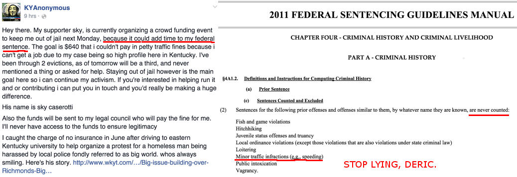 Deric has used his federal charges (which do not exist) as a basis to seek donations as evidenced by this screenshot. This particular screenshot was to raise donations to pay for court fines for driving without automobile insurance. Note how he states “sky, is currently organizing a crowd funding event to keep me out of jail next Monday, because it could add time to my federal sentence”. This is absolutely untrue. THERE ARE NO PENDING FEDERAL CHARGES and per the 2011 Federal Sentencing Guidelines, sentences for prior offenses such as minor traffic infractions, are NEVER COUNTED towards a federal sentence or adding additional time to it.