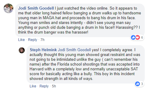 I mean…what can I even say about this comment from a local about the situation. An “older long haired fellow banging a drum walks up to a handsome young man in MAGA hat and proceeds to bang his drum in his face.” Seriously?