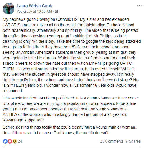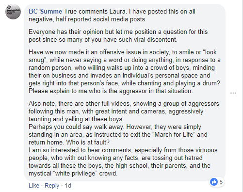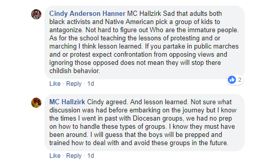 Nicholas Sandmann has since released a statement and in my opinion, it’s nothing more than a show of his privilege and failure to take ownership of his very obvious disrespect for an older person. My parents would have smacked the smirk right off of my face for doing what he did. Period. I can hear my father saying “Get that shit eating grin off your face or I’ll knock it off”. That’s what it was. It was a smirk. He was challenging an adult. Maybe it’s a generational thing? Or maybe his family is so out of touch with other cultures and people of color that it’s okay in their household to disrespect others. They obviously didn’t teach him not to get up in someone’s face. The MAGA hat just made the situation and any still photographs that are out there that much more obscene. As I wrote in my previous post, this particular school has had some issues in the past (rapey basketball player, blackface student at Halloween, harassing others because of their sexual preference). This appears as though these boys are being treated as though they are somehow better than others. No one wants to just take ownership for their behavior. I’ve read a lot of Facebook posts over the past two days and the rot starts at home. The diocese has condemned their actions and the parents are mad as hell because of it. However, families and friends of these “good boys” are terribly concerned about having their reputations ruined for all time. Oh my goodness! Poor PJ! Poor Squii! Poor Tobin and poor, poor Bart! I hope they mark this horrible day down on their calendars for reference to it in 20 years. /sarcasm