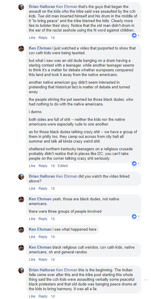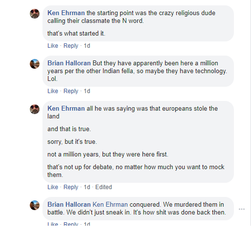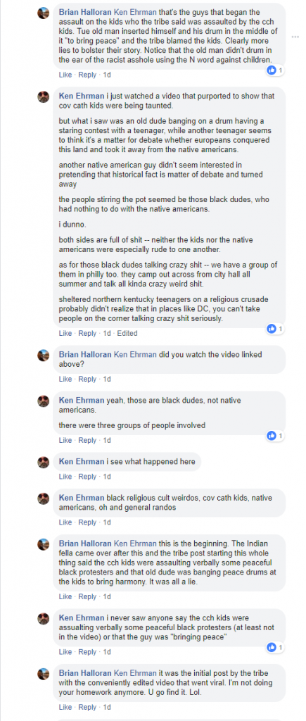 Edited to add: And there’s more. Local attorney Brian Halloran accuses the Native American tribe of altering video. I think what people are so repulsed by is the fact that these boys behaved like little assholes. They were disrespectful. What is so hard in admitting that they acted like disrespectful jerks? Some of his comments are just disgusting. Gosh, it’s hard to understand how these boys might act the way they do. /sarcasm
