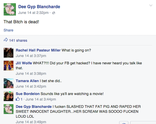 A few weeks ago, a friend posted on my Facebook about a missing persons/murder case in her hometown of Springfield, MO. The mother of a disabled girl was found stabbed to death in her bedroom, and the disabled daughter was gone - nowhere to be found, and her wheelchair was left behind. A strange message was posted on the Facebook account that they shared. That in itself caused me to give the ol side eye. Gypsy Blancharde was allegedly in her late teens yet shared a Facebook account with her mother? The message posted said “That bitch is dead” followed by an equally disturbing “I fucken SLASHED THAT FAT PIG AND RAPED HER SWEET INNOCENT DAUGHTER…HER SCREAM WAS SOOOO FUCKEN LOUD LOL.”