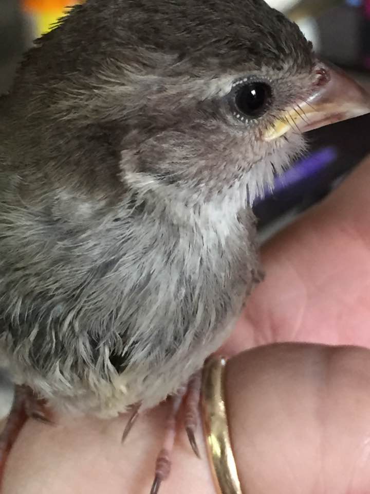 has imprinted and thinks that she is a human…and a dog. LOL The dogs adore her and have been very gentle with her. They were playing chase in the house the other day, and Wilson let her groom the loose hairs in his tail. Because she is so not afraid of them and so comfortable around them, I am very nervous about releasing her back into the wild for fear that she will try to make nice with the stalking neighbor cat that has taken up watch on my deck day in and day out. So, I guess I am now the proud bird mom of a baby sparrow. She’s been a joy to raise, and has come a long way from the fragile, little thing with pin feathers and a WC Fields profile. For a nondomestic bird, she really does have quite the personality.